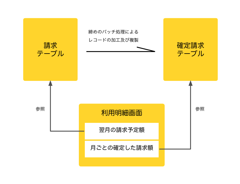 2年前のバッチ処理設計当初はデータ量が少なかったこともあり、バッチ処理全体にトランザクションを適用していました。利用明細画面の表示が締め処理により作成される確定請求テーブルに依存していたため(図「請求関連テーブルと利用明細画面との依存関係」を参照)、トランザクションの性質を利用することにより次の2つの状態を担保していました。