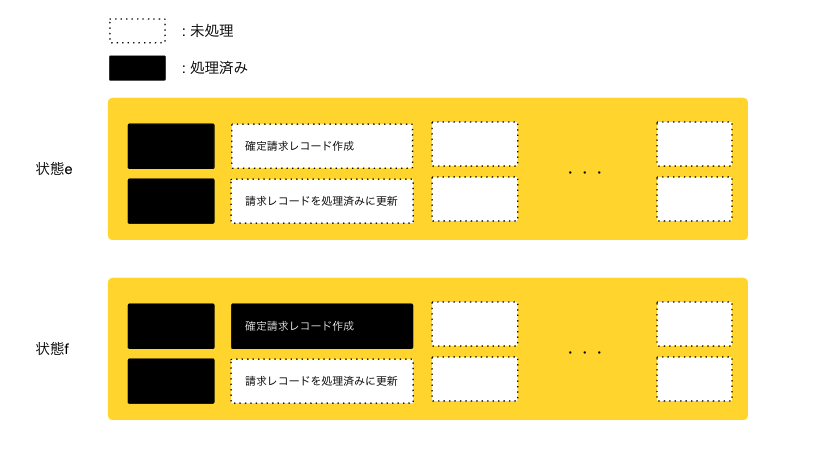 最後に状態eから状態fへのトランザクションによる遷移を考えます。これがトランザクションによる最小の処理と言えそうです。しかし、前提として確定請求レコードの作成と処理済みのフラグ更新は両方とも処理が成功するか、もしくは両方とも処理が失敗すべきかの状態が担保される必要があり、確定請求レコードの作成のみが処理されている状態fはアプリケーション上許容されません。これは一貫した状態への遷移とは言えなそうです。