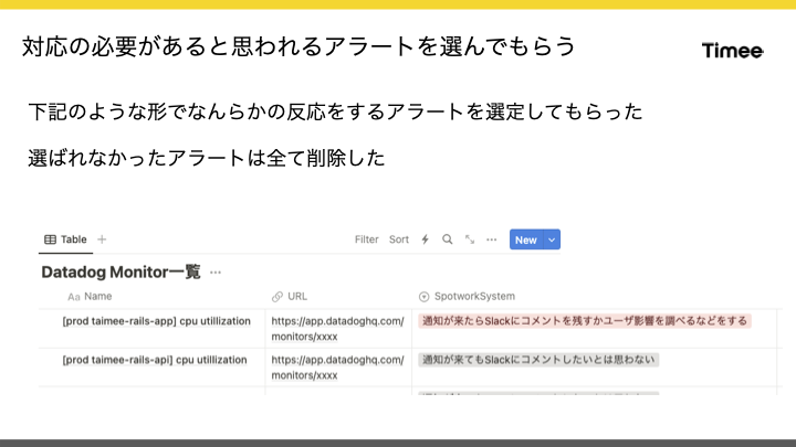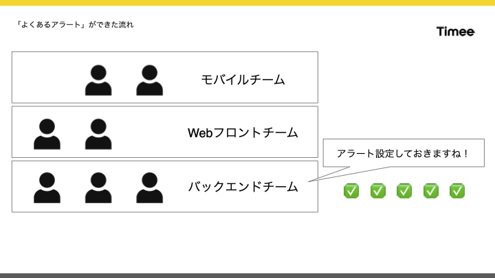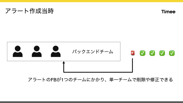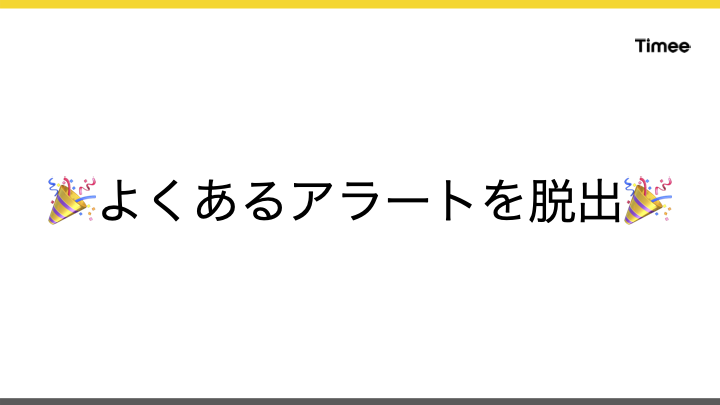 本来アラートはアクションを要求するための通知であるべきであり、アクションなしにアラートが鳴ることは無意味です。実際にタイミーにも、このような無駄なアラートが長期間存在していました。