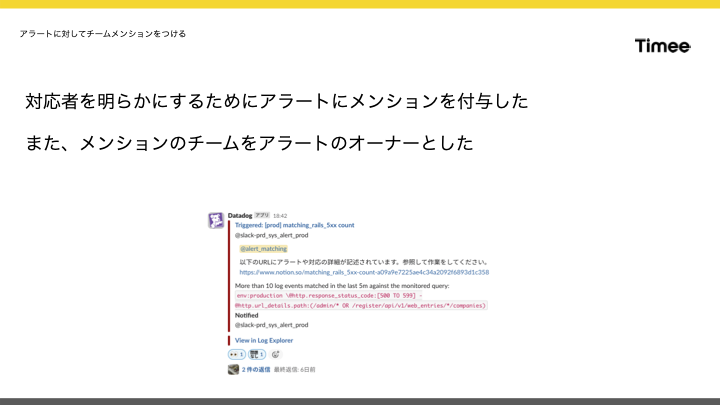 次に、アラートに対してチームメンションをつけることにしました。以前はアラートにメンションがなく、全てのチャンネル通知をオンにする運用でしたが、これではどのチームが対応すべきか不明確でした。そこで、アラートにメンションを付与し、「このメンションのチームがオーナーです」と伝えるようにしました。