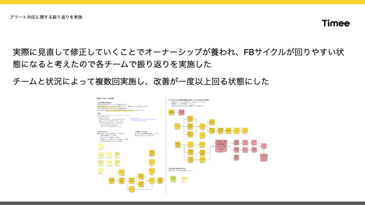 最後に、アラート対応に関する振り返りを実施しました。最初の改善はできるだけサポートするため、メンション付きのアラート対応について1ヶ月後に第1回の振り返りを各チームで行いました。これは、必要に応じて2回、3回と続けました。この流れで、チーム内での改善が少なくとも1回行われるところまで改善できました。