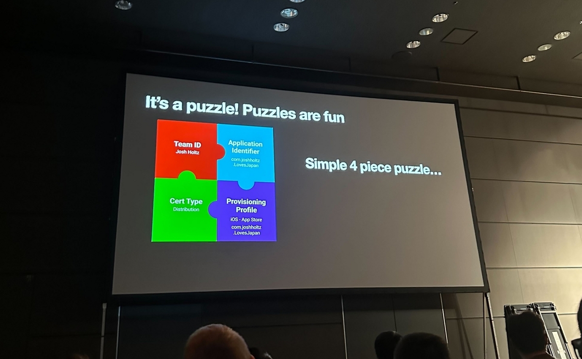 このセッションではCertificate、Provisioning Profile、Application Identifierなど、アプリをリリースする上で必要なコード署名の要素を分かりやすくパズルに見立てて解説していました。