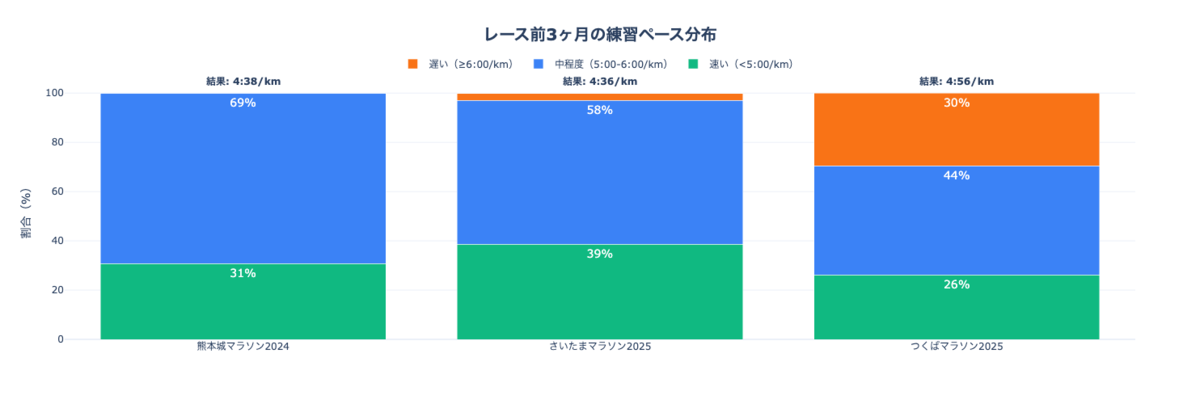 - ベストが出た時(さいたまマラソン、熊本城マラソン)は、速い練習の割合が30%以上、遅い練習は0-3%
