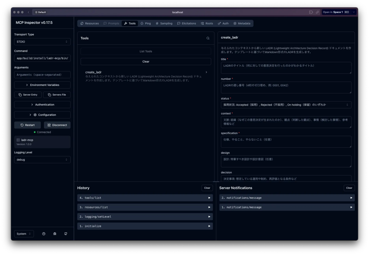 チームで運用している LADR のテンプレートに沿って登録しているため少し長いですが、addTool 内で input に対して output を定義するだけです。